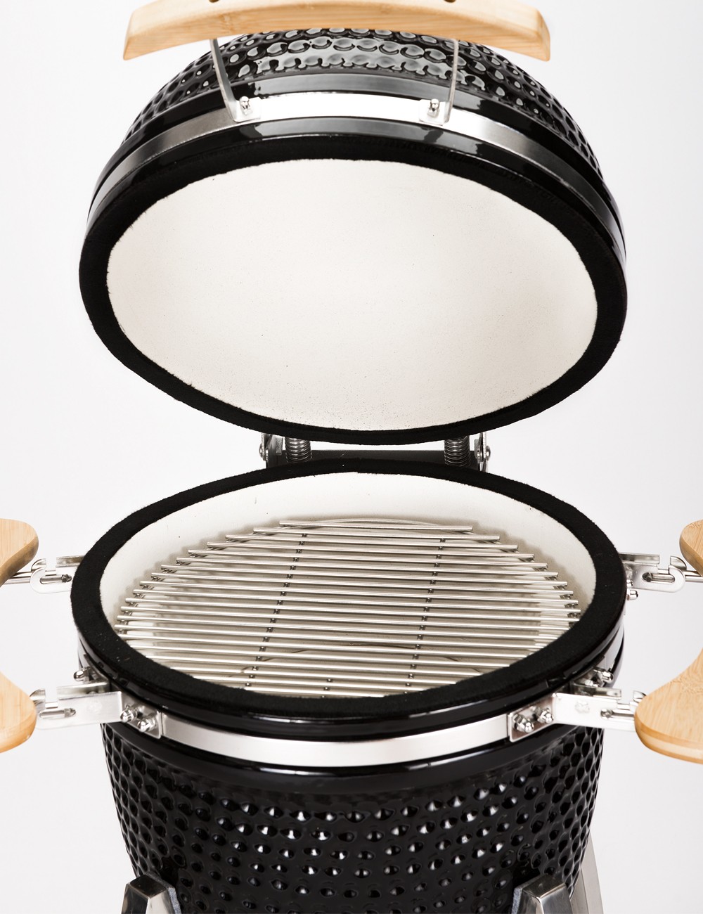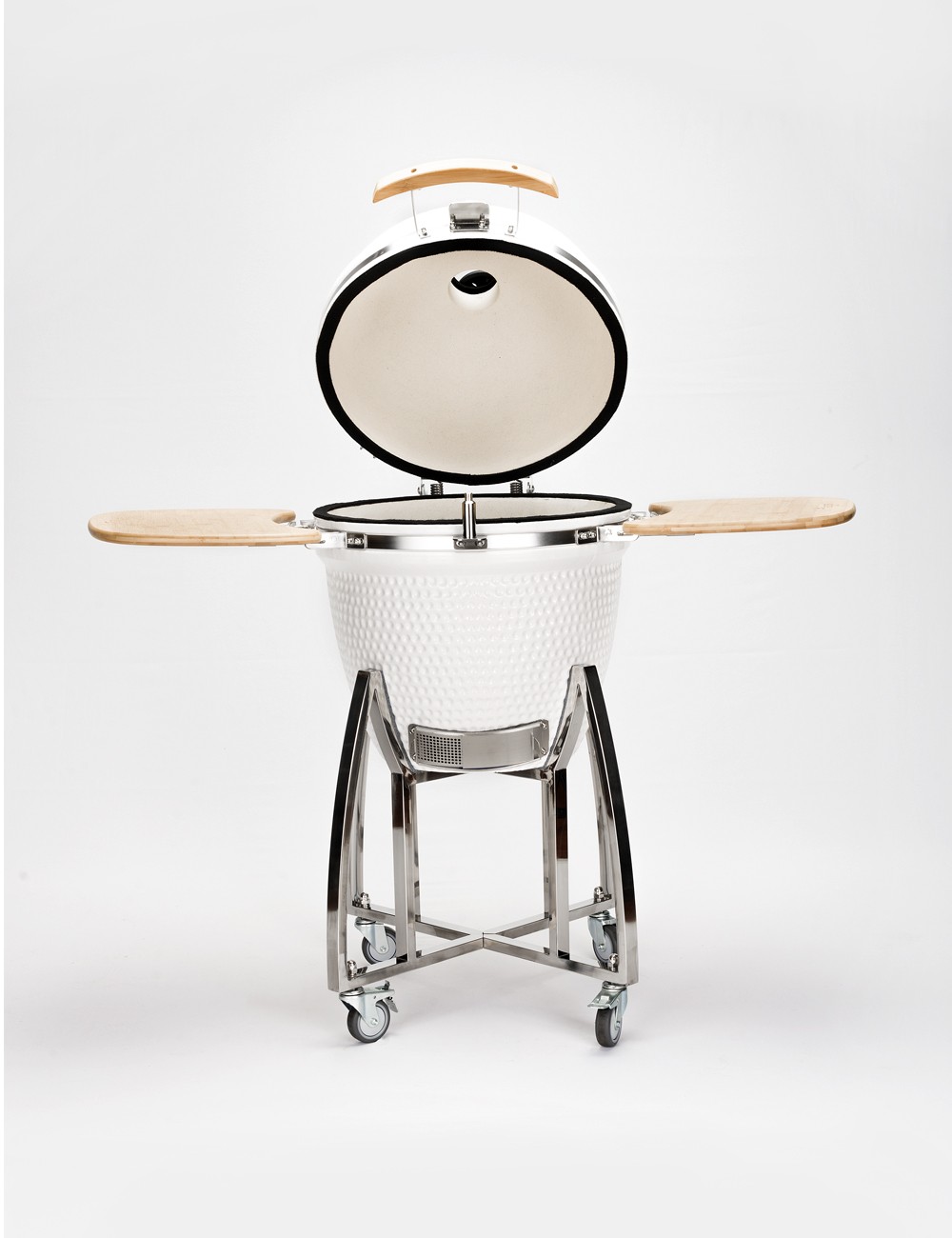 • Perilla superior en hierro fundido y rejilla inferior en acero inoxidable para control de aire según tipo de cocción (asar, ahumar, hornear)