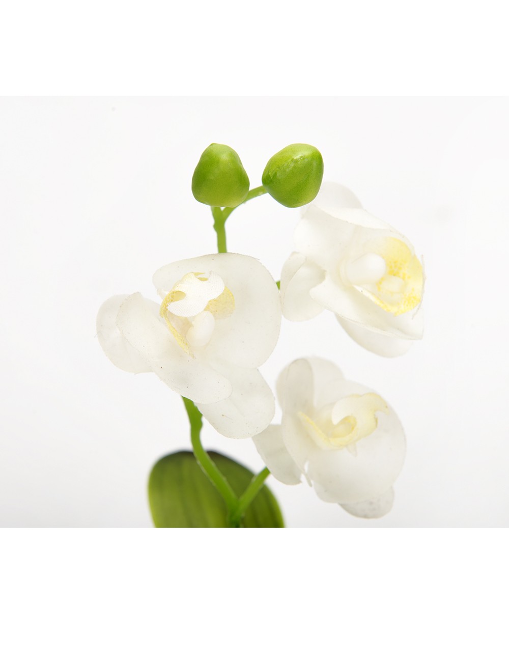 Esta orquídea mini blanca sintética ha sido diseñada con un alto nivel de realismo en textura, color y caída de pétalos, logrando una apariencia natural y sofisticada.